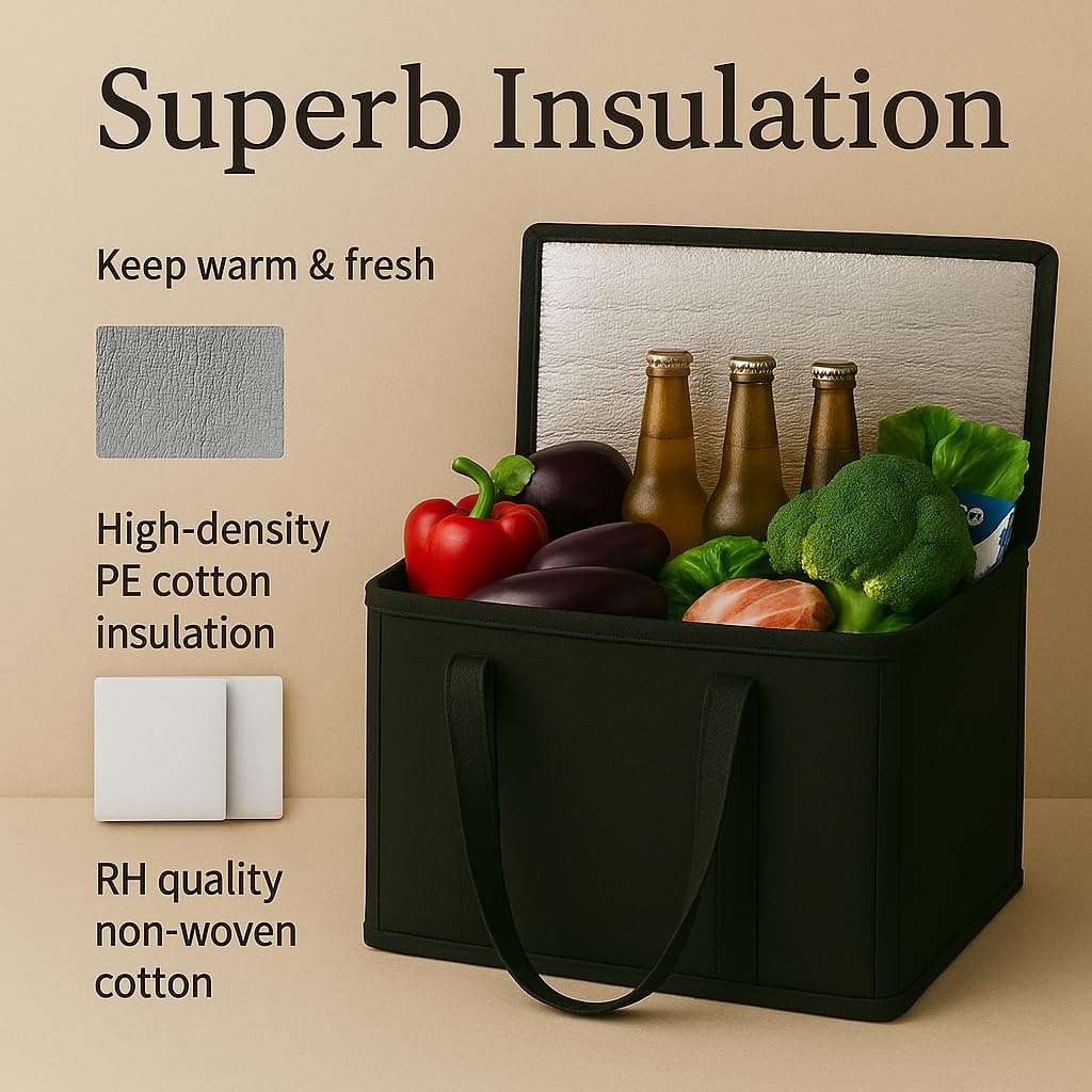 - Keep your food hot or cold for hours with this large insulated delivery bag. Made with durable non-woven fabric and aluminum thermal lining, this bag is perfect for food delivery, catering, groceries, and travel. It features strong handles, a heavy-duty zipper, leakproof interior, and a lightweight foldable design.